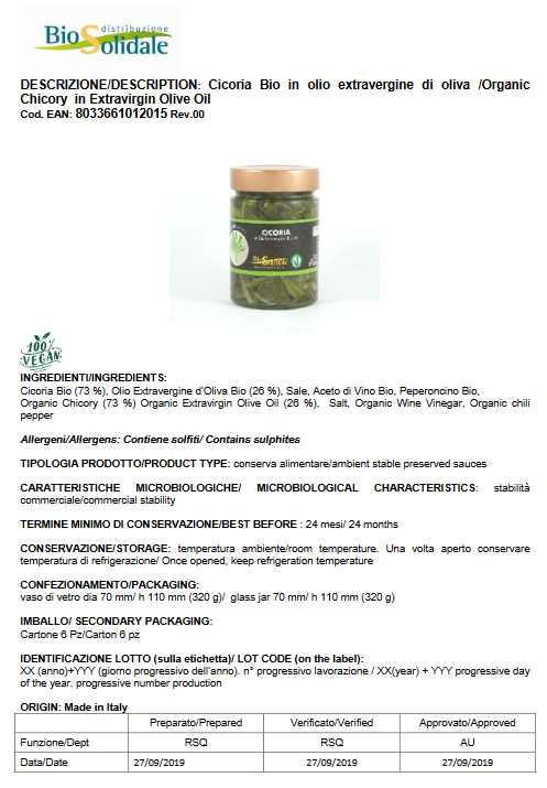 Prodotto realizzato con verdure dell’orto di BioSolidale e trasformate nel loro laboratorio artigianale seguendo le ricette della tradizione romana. Solo olio Extra Vergine di Oliva di alta qualità. Prodotto vegano. Certificato Biologico. Tutti gli ingredienti sono disponibili nella scheda “INFORMAZIONI AGGIUNTIVE”