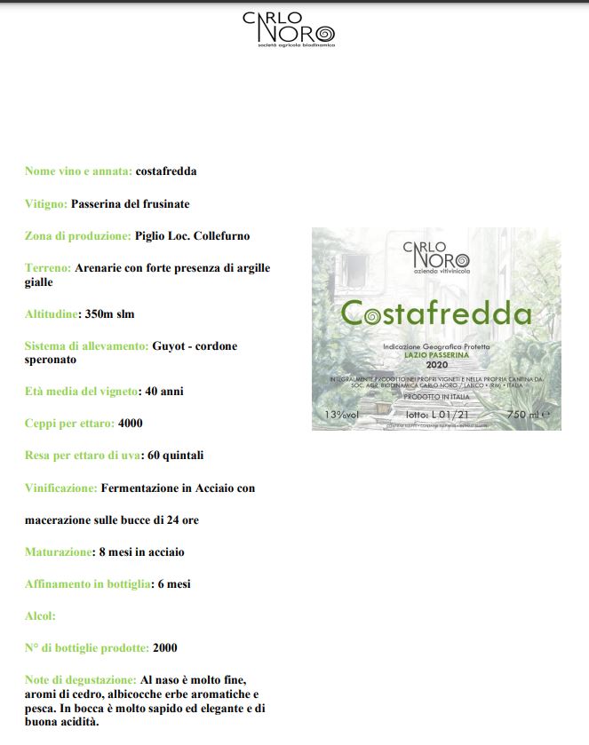 Vino “Costafredda” Passerina del Frusinate IGT della Società Agricola Biodinamica Carlo Noro