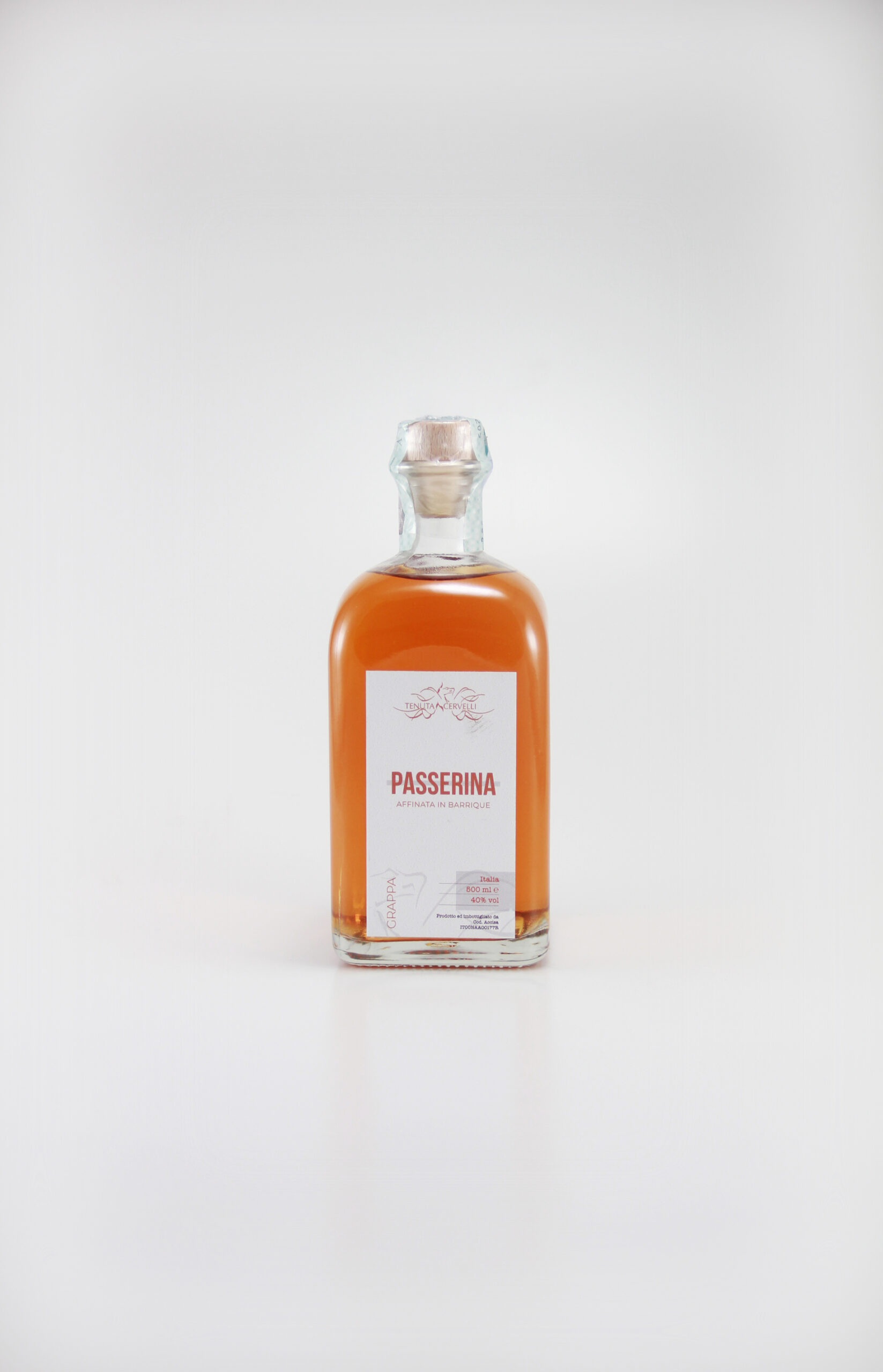 Grappa di Passerina affinata in botti di legno che le conferisce una brillante colorazione ambra. Al bicchiere e all’olfatto un delicato profumo speziato dolcemente arricchito con note di frutta matura.
