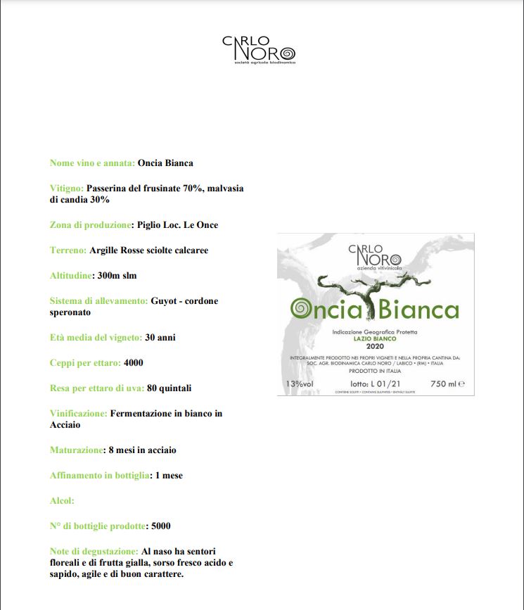 Vino “Oncia Bianca” Passerina e Malvasia IGT Lazio, imbottigliato all’origine dalla Società Agricola Carlo Noro.